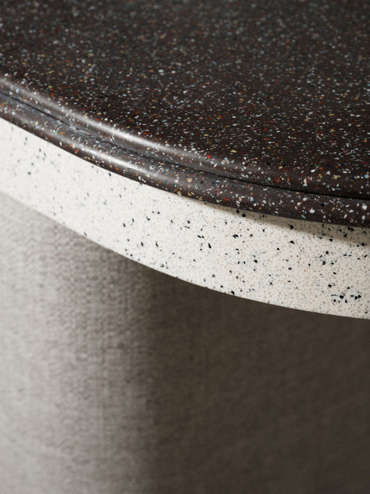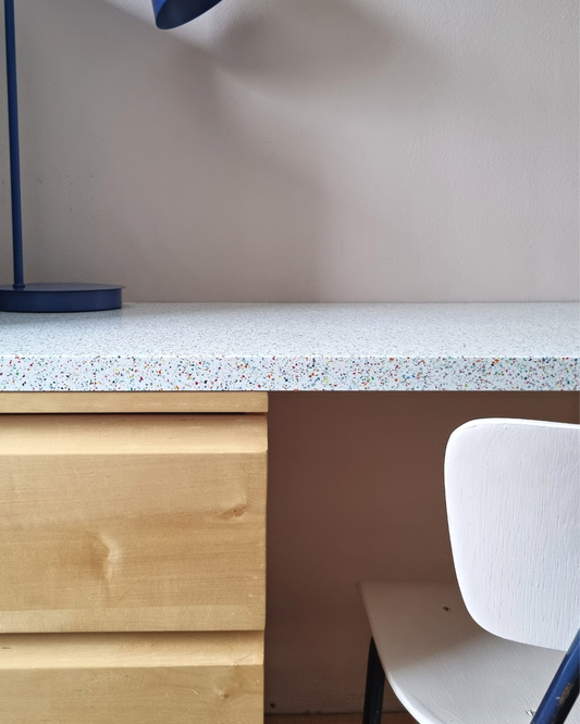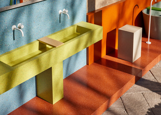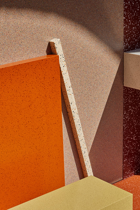 The multi-coloured colour range is made by using only recycled Durat as granulate. Cutoffs from our own production, and those bought back from other fabricators, are granulated and the different coloured speckles are mixed together and used as raw material for the new Durat.