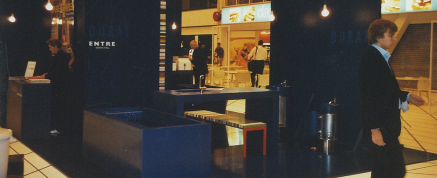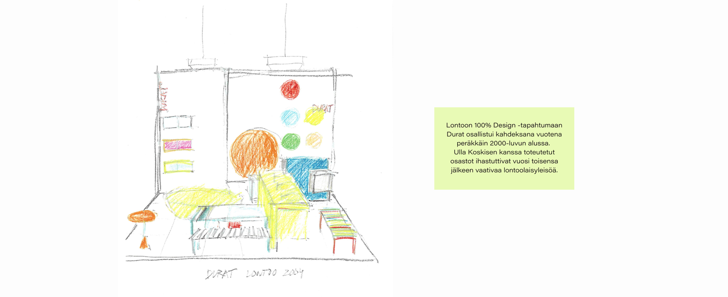 Durat osallistui Lontoon 100% Design -tapahtumaan ensimmäistä kertaa vuonna 2000. Se oli tapahtuma, jonka osallistujat valittiin huolellisesti - kuka tahansa ei päässyt mukaan. Osasto rakennettiin Design Collection-kalustesarjan varaan. Osallistuimme tapahtumaan kahdeksana vuonna peräkkäin.