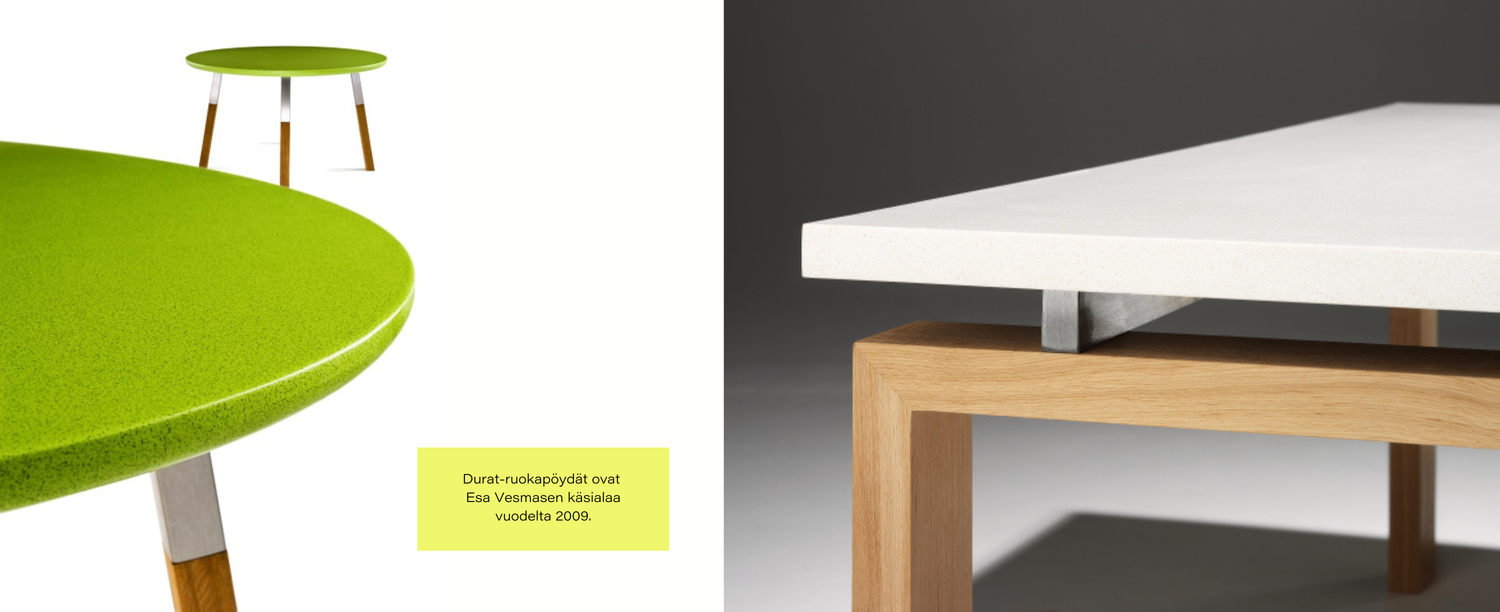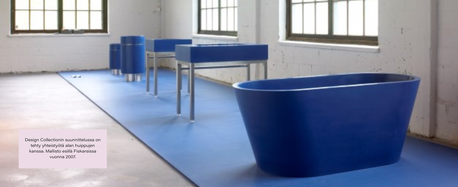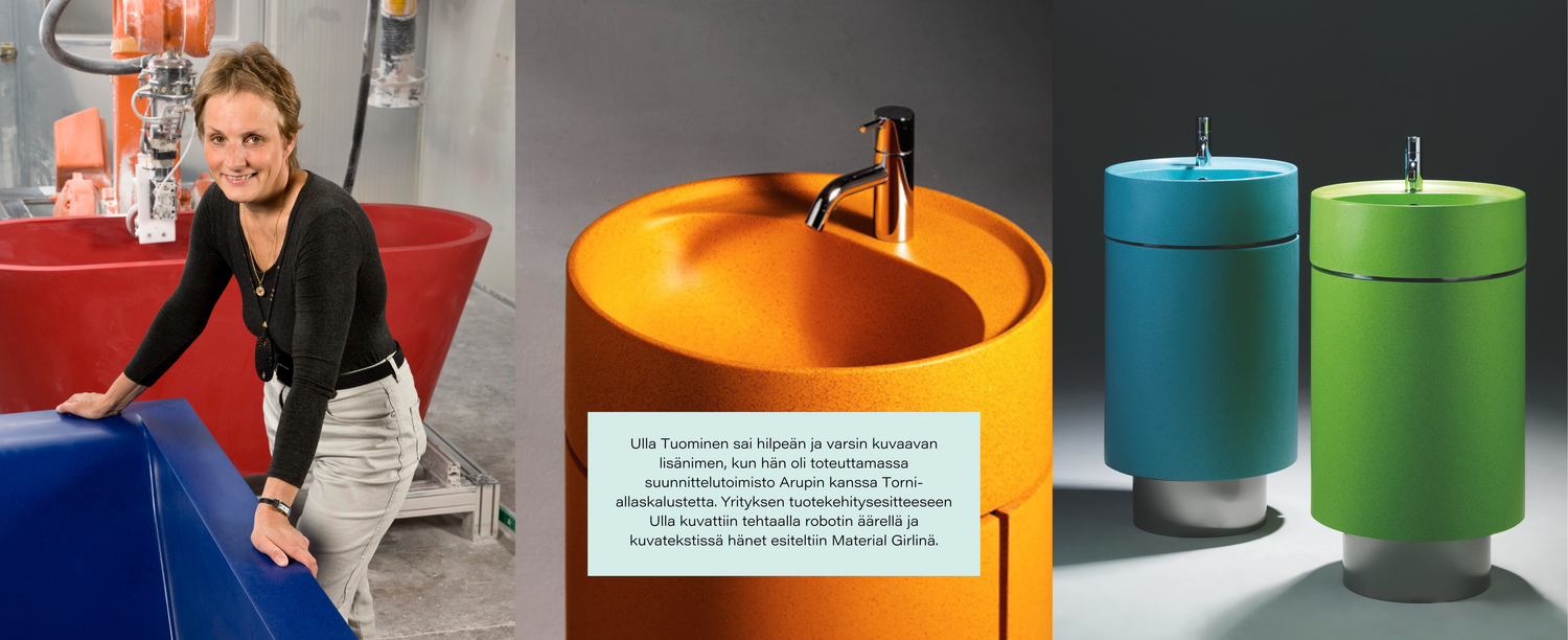 Ulla Tuomisen johdolla tuotesuunnittelussa on koko ajan panostettu vahvaan muotoiluosaamiseen. Yritys lähti rohkesti design-messuille, vaikka solid surface valmistajat olivat yleensä mukana materiaalimessuilla.