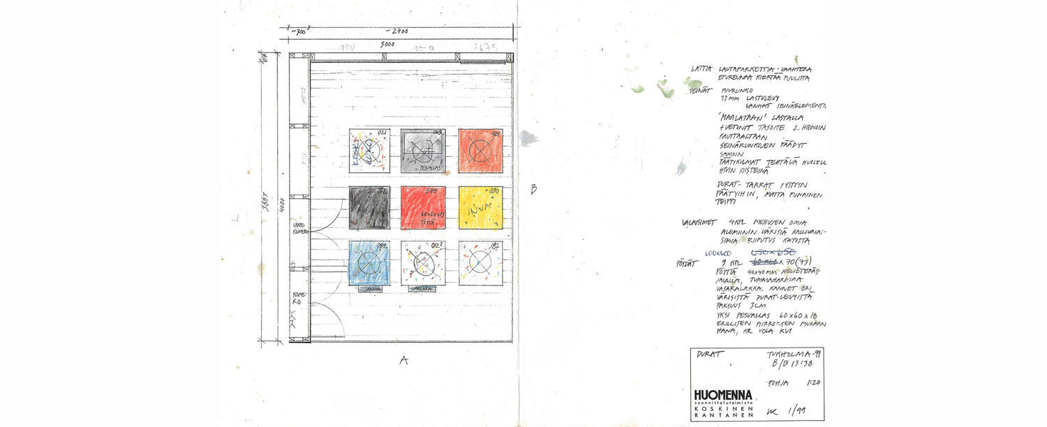 “Alkuperäisen värikartan rakentamisessa konsultoin Pirkko-Liisa Topeliusta. Hänen vinkkiensä perusteella aloitettiin väreillä, joita arkkitehdit aina haluavat: valkoinen, musta ja useita harmaan sävyjä. Tehosteväreinä paletissa olivat puhtaat punainen, sininen, vihreä ja keltainen”, Ulla kertoo.