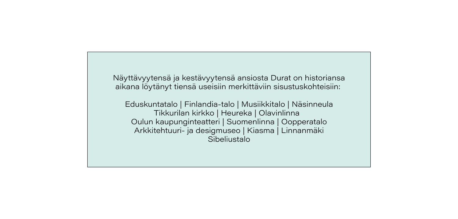 Ullalla oli vankka taidealan koulutus ja hän oli ennen Duratin perustamista työskennellyt muun muassa yhden Suomen tunnetuimman sisustusuunnittelijan, Pirkko-Liisa Topeliuksen toimistossa. Sen vuoksi aivan alusta alkaen tuotekehitystyössä on korostettu designin merkitystä. Tavoitteena oli ja on kehittää materiaali, joka paitsi laadullisesti myös visuaalisesti sopisi kaikkein vaativimpienkin kohteiden sisustamiseen.