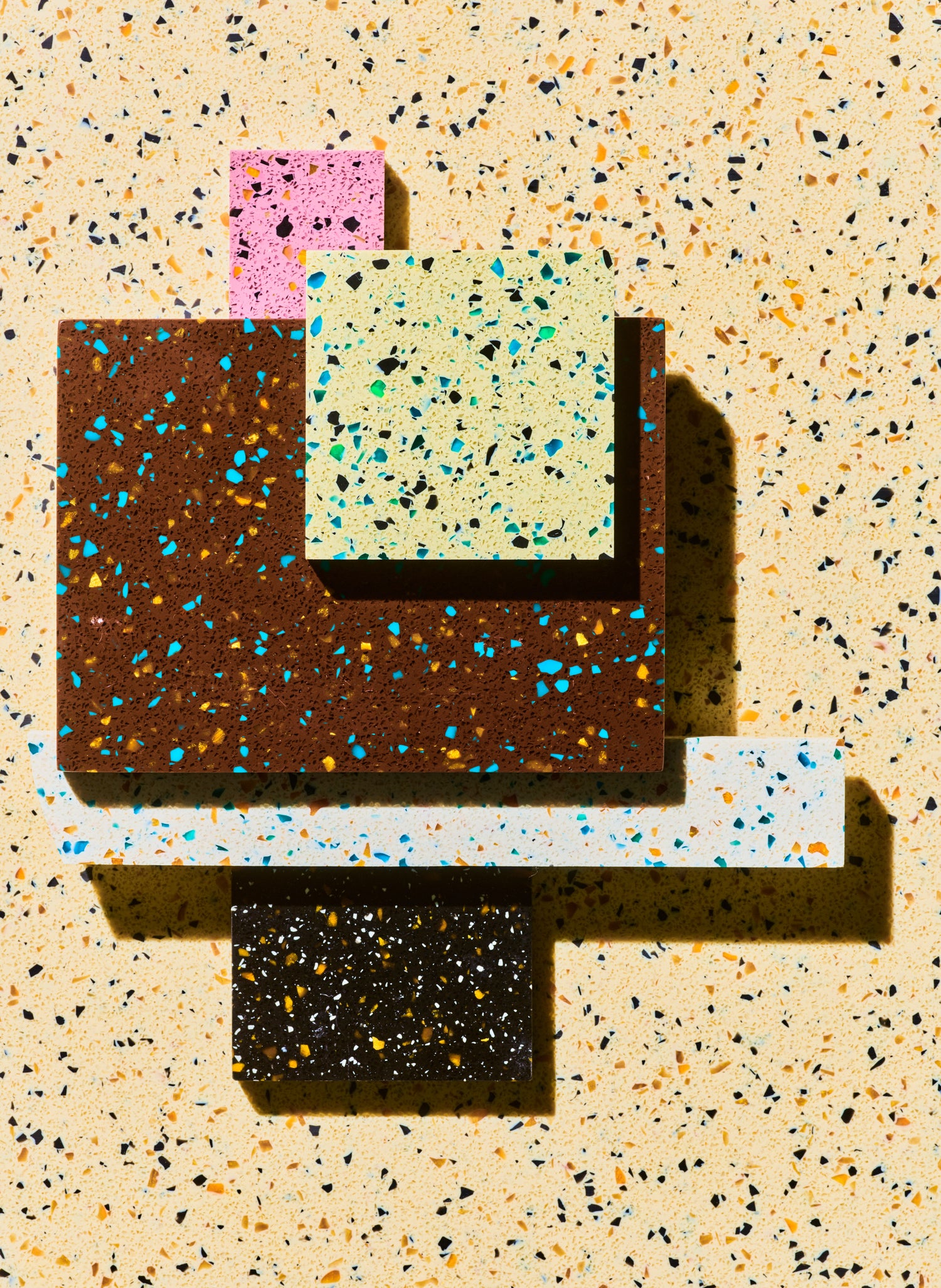 Four options for large terrazzo-inspired speckles: clear, black, multicolour, white